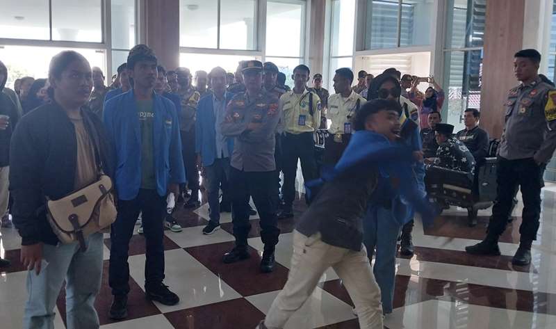 FOTO ANIS PRABOWO JURNALIS KORANLOMBOK.ID / Massa dari PMII Lombok Tengah saat melempar telur dan air mineral gelas di dalam lobby ruang sidang utama Gedung DPRD setempat, Selasa (16/7/2024).