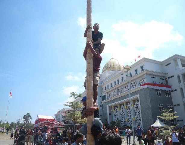 FOTO ANIS PRABOWO JURNALIS KORANLOMBOK.ID / Warga antusias mengikuti lomba panjat pinang di halaman Kantor Bupati Lombok Tengah memperingati HUT RI ke 80.