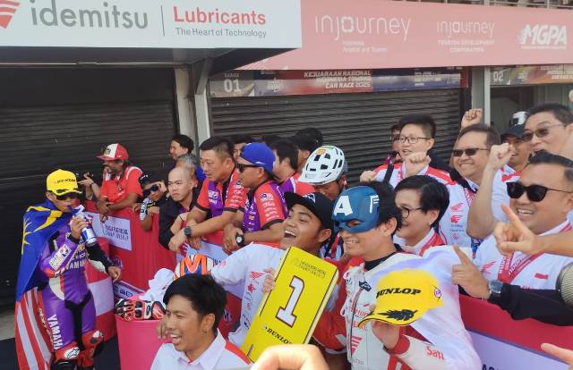 FOTO HILMI JURNALIS KORANLOMBOK.ID / Fadillah Arbi Aditama foto bersama Astra Honda Racing Team usai menjadi tercepat di ARRC Kategori AP250 di Sirkuit Mandalika 2025, Sabtu (30/8/2025).