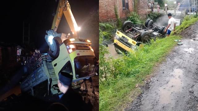 Truk Pengangkut Semen Bantuan Terbalik Hingga Masuk Saluran Irigasi